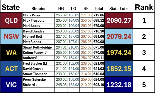 - The placings, 1st, 2nd and 3rd are worked out by the aggregated scores of the top 3 shooters from each state. (See attached photos for example)